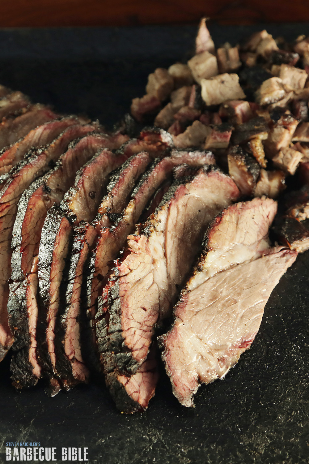 Step 7: To serve, trim off any burnt edges and dice. (You’ll serve these as snacks to warm people up for the meat.) Trim off and discard any large lumps of fat. Holding your knife parallel to the cutting board, cut the deckle (top section) off the brisket flat. Scrape away and discard any fat or collagen between them. Lay the deckle atop the flat, rotating it so that the grain of the meat lines up with that of the flat. Cut crosswise into ¼-inch slices and serve with any brisket juices drizzled on top.
